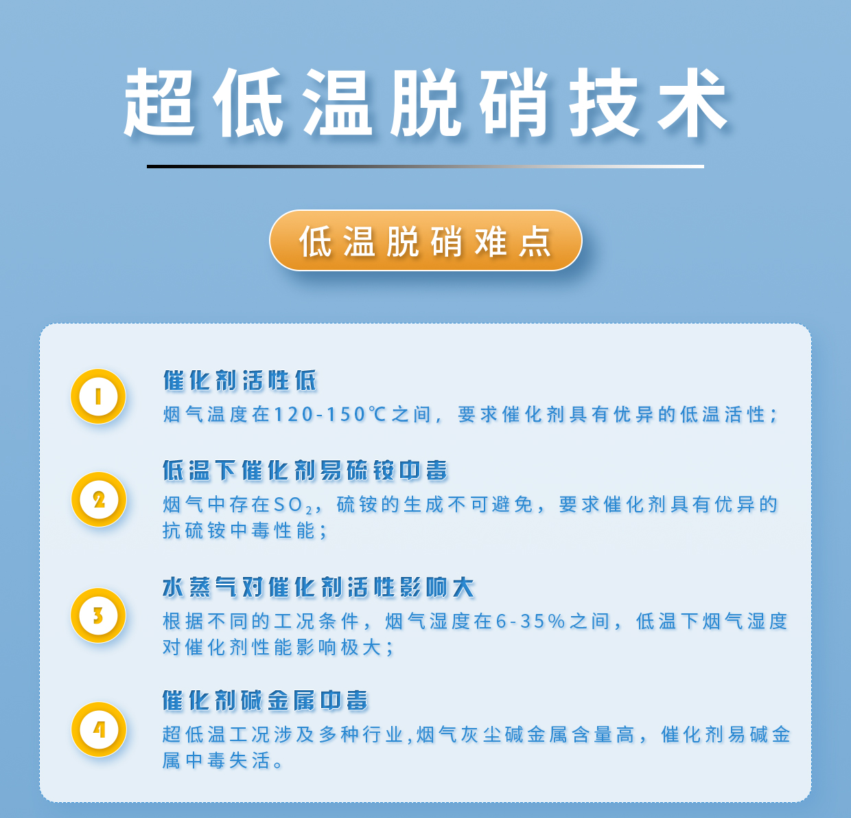 产品特点 催化剂具有优异的超低温脱硝性能,在140℃脱硝温度下效率可达90%以上,