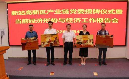2022年8月,新站高新区举行产业链党委授牌仪式暨当前经济形势与经济工作报告会,图为区党工委委员、管委会副主任高同国向区集成电路、新型显示、高端装备制造、节能环保四大产业链党委授牌